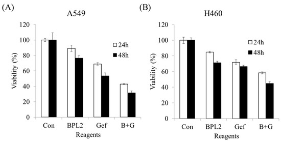 Concomitant treatment with gefitinib and BPL2 (10 μM and 10 μg/mL, respectively) showed a synergistic effect on the cancer cell lines compared with monotherapy. BPL2 or gefitinib monotherapy showed approximately 90% and 70% A549 cell viability, respectively, while concomitant therapy showed approximately 40% viability in the same cell line (Figure 8A). H460 cells treated with a combination of gefitinib-BPL2 did not show as much decrease in viability compared to A549 cells (Figure 8B). An increase in incubation time with the treatment agents led to a further 10% reduction in cell viability in both cell lines.