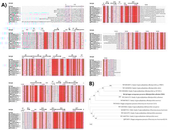 Multiple sequence alignment (A) and phylogenetic tree (B) of RsCgk with other κ-carrageenases deposited in NCBI database. The amino acid sequences of κ-carrageenases derived from Rhodopirellula sallentina (NCBI ID: WP_236621372.1), Rhodopirellula sp. ICT_H3.1 (NCBI ID: WP_250928804.1), Rhodopirellula sp. SWK7 (NCBI ID. WP_009104871.1), Rhodopirellula rubra (NCBI ID: WP_184306584.1), Rhodopirellula maiorica (NCBI ID: WP_008708327.1), Planctomycetes bacterium CA13 (NCBI ID TWT83628.1), Rubripirellula reticaptiva (NCBI ID: WP_146535064.1), Planctomycetaceae bacterium (NCBI ID: MCB9875741.1), Rubripirellula amarantea (NCBI ID: WP_242631975.1), Rubripirellula tenax (NCBI ID: WP_146457934.1), and Planctomycetes bacterium K23_9 (NCBI ID: QDT10653.1) were used for alignment and phylogenetic tree analysis.