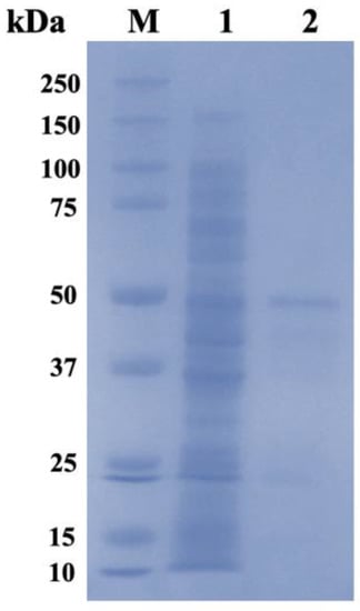 The recombinant strain BL21 (DE3) that carried the pET-28a(+)-RsCgk plasmid was induced by IPTG to produce recombinant RsCgk, which was further purified by a Ni-NTA agarose column. The result of SDS-PAGE (Figure 2) indicated that the molecular mass of the expressed RsCgk was about 42.5 kDa, which was consistent with the theoretical molecular mass of the enzyme according to the amino acid sequence of RsCgk. The enzymatic activity of RsCgk was 32.9 U/mg. The purified RsCgk was used in further investigations of enzymatic characteristics.
