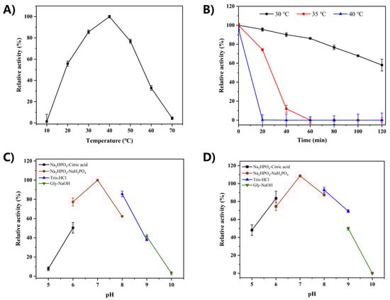 Effects of pH and temperature on the activity and stability of RsCgk. (A) The optimal temperature of RsCgk. The activities of RsCgk were assayed at various temperatures (10–70 °C). (B) The thermal stability of RsCgk. The residual activities of RsCgk were assayed after being kept at different temperatures (30 °C, 35 °C, and 40 °C) for 120 min. Relative activity is calculated as a percentage of initial activity. (C) The optimal pH of RsCgk. RsCgk activities were assayed in Na2HPO4–citric acid buffer (50 mM, pH 5.0–6.0), Na2HPO4–NaH2PO4 buffer (50 mM, pH 6.0–8.0), Tris–HCl buffer (50 mM, pH 8.0–9.0), and glycine–sodium hydroxide buffer (50 mM, pH 9.0–10.0). Relative RsCgk activities were calculated using the activity measured at optimum pH as 100%. (D) The pH stability of RsCgk. The residual activities of RsCgk were measured after the enzyme was incubated in the buffers described above (50 mM, pH 5.0–10.0) at 4 °C for 24 h. Residual RsCgk activities were calculated by using the highest residual activity as 100%. Data represent the mean ± standard deviation of triplicate measurements.