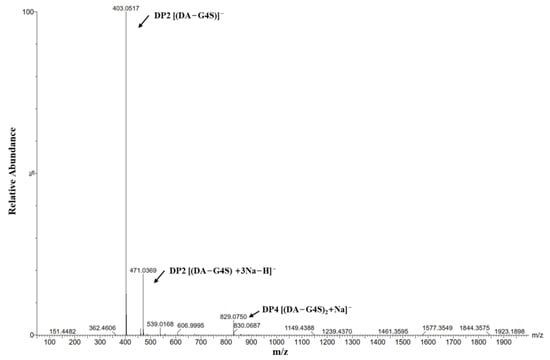 After 24 h of degradation reaction, the RsCgk degradation product was analyzed using ESI-MS. As shown in Figure 4, the main degradation product of κ-carrageenan using RsCgk is κ-carrabiose. Only a small amount of κ-carratetraose was detected. There was no κ-carrahexaose or other κ-carrageenan oligosaccharides with higher degrees. Most reported κ-carrageenase [,] degraded κ-carrageenan into κ-carrageenase oligosaccharides with different forms (κ-carrabiose, κ-carratetraose, κ-carrahexaose, etc.), which was difficult for oligosaccharide purification and application. Our results indicated that RsCgk could effectively hydrolyze κ-carrageenan into uniform κ-carrabiose, which was beneficial for reducing the cost of further oligosaccharide purification and the production of high-value-added carrageenan products. Except for our study, there are currently only two κ-carrageenase from Polaribacter sp. NJDZ03 [] and Vibrio sp. SY01 [] that are able to specifically degrade κ-carrageenan into κ-carrabiose.