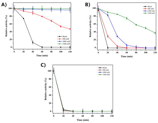 The effects of different NaCl concentrations (0–1500 mM) on the thermal stability of RsCgk. (A) 35 ℃. (B) 40 ℃. (C) 45 ℃. Residual RsCgk activities were calculated by using the initial residual activity as 100%. Data represent the mean ± standard deviation of triplicate measurements.
