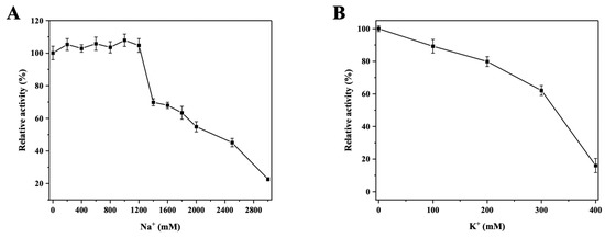 Potassium ions show great differences in the enzymatic activity of κ-carrageenases of different sources. The activity of κ-carrageenase from Tamlana sp. HC4 [] was critically inhibited by 50.87% with only 1 mM K+, while 100 mM K+ reduced the activity of κ-carrageenase from the Cellulophaga lytica strain N5-2 [] by 76.40%. κ-carrageenase from Pseudoalteromonas carrageenovora ASY5 [] exhibited enhanced activity (160%) with the addition of 100 mM K+, but completely lost activity at 200 mM K+. Our study found that RsCgk could retain 89.23%, 79.84%, 62.11%, and 16.01% of its activity in 100 mM, 200 mM, 300 mM, and 400 mM KCl (Figure 6B), which exhibited the highest potassium salt tolerance among current reports. The ability to perform a degradation reaction at a high concentration of sodium and potassium ions makes RsCgk a suitable tool for utilizing carrageenan extraction wastes.