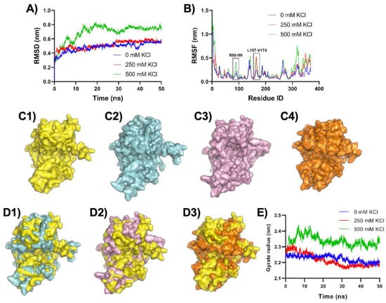 (A) RMSDs of RsCgk in 0 mM, 250 mM, and 500 mM KCl during 50 ns MD simulations as a function of time relative to its initial structure. (B) RMSFs of RsCgk in 50 ns MD simulations of RsCgk in 0 mM, 250 mM, and 500 mM KCl. The most affected domains, Loop R80-I99 and Loop L157-V174, are highlighted using black boxes. (C1) The surface presentation of RsCgk with salt addition. (C2) The surface presentation of RsCgk with 250 mM KCl. (C3) The surface presentation of RsCgk with 500 mM KCl. (C4) The surface presentation of RsCgk with 500 mM NaCl. (D1) The surface comparison of RsCgk with and without 250 mM KCl. (D2) The surface comparison of RsCgk with and without 500 mM KCl. (D3) The surface comparison of RsCgk with and without 500 mM NaCl. (E) Gyrate radius of RsCgk in 0 mM, 250 mM, and 500 mM KCl during 50 ns MD simulations.