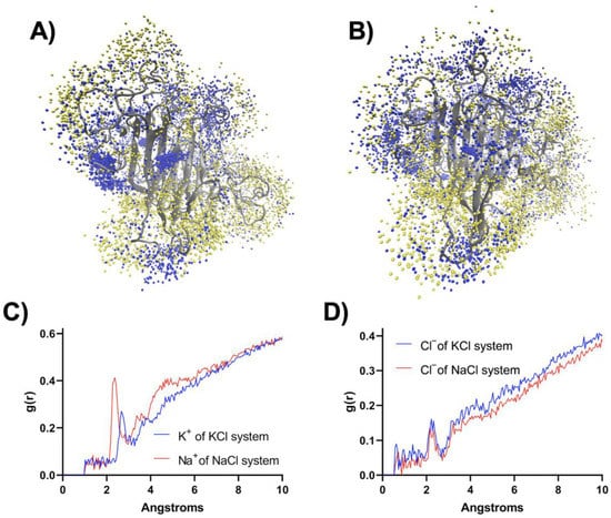 (A) The distribution of K+ (depicted as blue spheres) and Cl− (depicted as yellow spheres) within 3 Å of the RsCgk surface. The presentation includes K+ and Cl− from 200 frames covering the 50 ns MD trajectory of RsCgk in 500 mM KCl. (B) The distribution of Na+ (depicted as blue spheres) and Cl− (depicted as yellow spheres) within 3 Å of the RsCgk surface. The presentation included Na+ and Cl− from 200 frames covering the 50 ns MD trajectory of RsCgk in 500 mM NaCl. (C) Radial distribution functions (g(r)) for K+ and Na+ against RsCgk in 500 mM KCl or NaCl. RDFs were calculated using 200 frames of the 50 ns MD trajectory. (D) Radial distribution functions (g(r)) for Cl− against RsCgk in 500 mM KCl or NaCl. RDFs were calculated using 200 frames of the 50 ns MD trajectory.