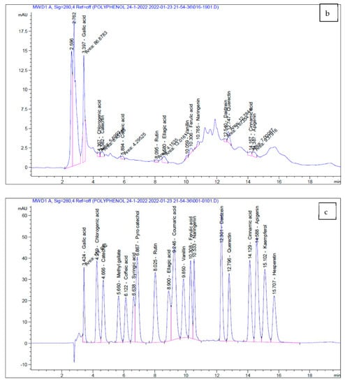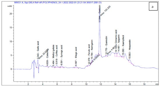 To identify bioactive compounds in C. tomentosum and A. fragilis aqueous extracts, high-performance liquid chromatography (HPLC) was used. The HPLC chromatogram of standards and phenolic compounds of C. tomentosum and A. fragilis aqueous extracts are shown in Table 7 and Figure 1.