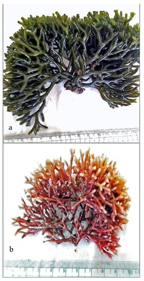 The collected marine algae: (a) Codium tomentosum (green algae) and (b) Actinotrichia fragilis (red algae).