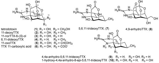 - Nakamura, M.; Yasumoto, T. Tetrodotoxin derivatives in puffer fish. Toxicon 1985, 23, 271–276. [Google Scholar] [CrossRef]