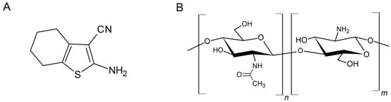 Structural representation of (A) 2-amino-4,5,6,7-tetrahydrobenzo[b]thiophene-3-carbonitrile (6CN); (B) chitosan.