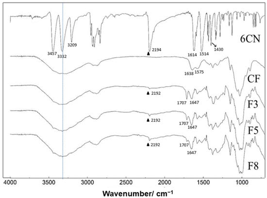 FTIR spectra of 2-amino-4,5,6,7-tetrahydrobenzo[b]thiophene-3-carbonitrile (6CN), blank chitosan film (CF), and 6CN-chitosan films with 6CN concentrations of 0.48 mg·mL−1 (F3), 0.80 mg·mL−1 (F5), and 1.28 mg·mL−1 (F8). (▲) C≡N stretching.