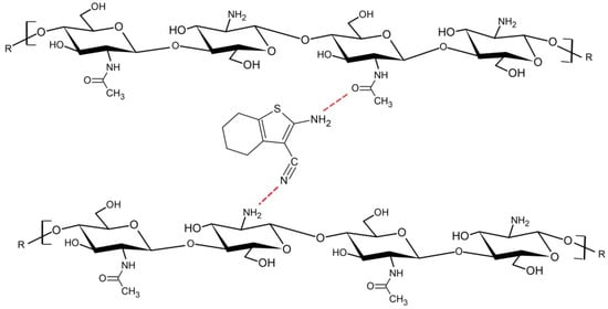 According to the spectral changes that were found, 6CN interaction with the polymer matrix can be suggested. In particular, the displacement of the stretching of 6CN C≡N bond from 2194 to 2192 cm−1 and that of the stretching of C=O of chitosan acetyl group from 1638 to 1647 cm−1, as well as the presence of wide bands in the NH stretching region, suggest the occurrence of possible (1) hydrogen interactions between the chitosan amino groups (-NH2) and the 6CN nitrile group, and (2) interactions between the polymer carbonyl and the 6CN amino group, as shown in Figure 3.