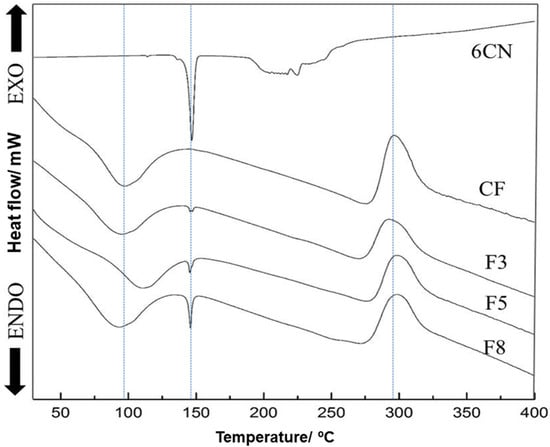 Additionally, a second endothermic event was verified for films between 144 and 150 °C (Tonset 144 °C, Tendset 150 °C, Tpeak 148 °C) that corresponds to the 6CN melting peak and is the more evident the higher its concentration in the films. A third event of the exothermic type that occurred in the temperature range from 280 to 320 °C can be attributed to polymer degradation, while thermal degradation of 6CN in the films was not clearly evident in the thermograms.