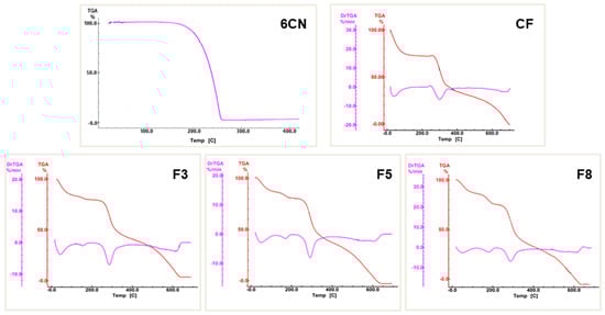 Thermogravimetric curves of 2-amino-4,5,6,7-tetrahydrobenzo[b]thiophene-3-carbonitrile (6CN), blank chitosan film (CF), and 6CN-chitosan films with 6CN concentrations of 0.48 mg·mL−1 (F3), 0.80 mg·mL−1 (F5), and 1.28 mg·mL−1 (F8).