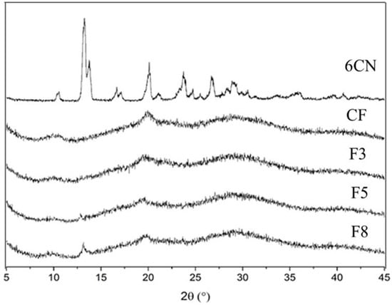 CF exhibited low crystalline reflections with some weak diffraction peaks centered at 20°, which can be attributed to the usually amorphous state of CF [29]. 6CN-chitosan films presented diffraction halos that were characteristic of amorphous structures, as well as crystalline reflections that started at 10° and 20°, that were characteristic of the chitosan diffractogram. F5 and F8 films were partially amorphous which is in agreement with the results of DSC, confirming the presence of 6CN and due to their higher 6CN contents compared to F3.