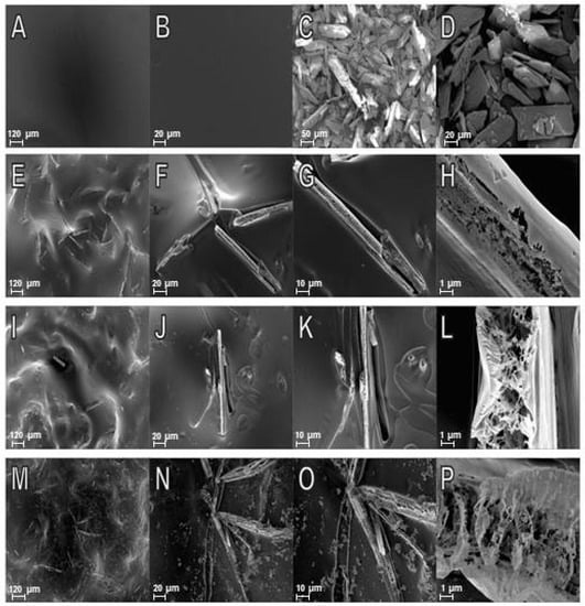 SEM micrographs of blank chitosan film at (A) 100× and (B) 500×; of 2-amino-4,5,6,7-tetrahydrobenzo[b]thiophene-3-carbonitrile (6CN) at (C) 150× and (D) 500×; of 6CN-chitosan films with 6CN concentration of 0.48 mg·mL−1 (F3) at (E) 100×, (F) 500×, (G) 1000×, and (H) 10,000×; of 6CN-chitosan films with 6CN concentration of 0.80 mg·mL−1 (F5) at (I) 100×, (J) 500×, (K) 1000×, and (L) 10,000×; of 6CN-chitosan films with 6CN concentration of 1.28 mg·mL−1 (F8) at (M) 100×, (N) 500×, (O) 1000×, and (P) 10,000×.