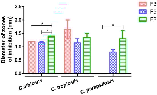 Diameter of the inhibition zones that were caused by 6CN-chitosan films (F3, F5, and F8) against Candida albicans, Candida tropicalis, and Candida parapsilosis. Values were expressed as the mean ± standard error of mean. (n = 3, * p < 0.05).