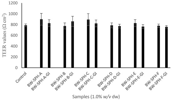 After 21 days, cell monolayers were considered to have reached confluence and were fully polarised with TEER values exceeding 700 Ω·cm2. As shown in Figure 1, BWSPHs and SGID BWSPHs did not alter cell monolayer integrity, with TEER values ranging from 774.3 ± 57.2–898.3 ± 109.3 Ω·cm2 and 758.0 ± 23.7–860.0 ± 94.3 Ω·cm2, respectively, compared with the HBSS buffer control (787.0 ± 26.2 Ω·cm2) after 4 h exposure. An inflammatory effect of BWSPHs and their corresponding gastrointestinal digests on human intestinal epithelial cells was investigated by measuring the reputable pro-inflammatory cytokine, interleukin (IL)-6 in the apical compartment of Caco-2/HT-29MTX co-cultured cells which were exposed to the test samples for a 4 h period. IL-6 concentrations in the co-culture apical compartments containing BWSPHs, SGID BWSPHs or HBSS buffer were below the minimum limit of detection (4 pg/mL), indicating that these protein hydrolysates could not induce an IL-6 response upon contact with gut epithelial cells.