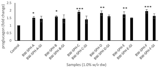 To determine the potential of BWSPHs to modulate satiety, their ability to produce satiety hormones at a transcriptional level and increase active GLP-1 secretion in murine enteroendocrine STC-1 cells was assessed. GLP-1 precursor proglucagon mRNA transcript levels were upregulated upon exposure of STC-1 to BWSPHs for 4 h compared with the negative control (Krebs–Ringer buffer) (p < 0.05) (Figure 2). However, post-SGID BWSPHs (BW-SPH-A-GI to BW-SPH-F-GI) did not alter proglucagon production significantly (p > 0.05) compared to the basal control. In addition, no significant differences were observed between proglucagon levels produced by BWSPHs before SGID and after SGID (Figure 2).