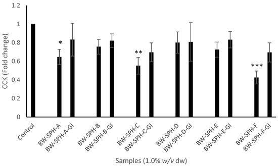 The cytotoxicity of six BWSPHs (BW-SPH-A to BW-SPH-F) and six SGID BWSPHs (BW-SPH-A-GI to BW-SPH-F-GI) (0–1.0% w/v dw) in STC-1 cells (Supplementary Table S1) and a Caco-2/HT-29MTX co-cultured cells (Supplementary Table S2) after 24 h incubation, was studied. There was no significant difference in the viability of cells exposed to BWSPHs (0–1.0% w/v dw) compared with the control (DMEM) indicating the non-toxic effect of BWSPHs and their corresponding simulated gastrointestinal digests in STC-1 cells and the co-cultured cells (Supplementary Tables S1 and S2). Based on these results, a protein hydrolysate concentration of 1.0% w/v dw was chosen for all cellular assays.
