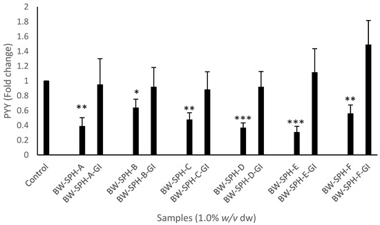 Hydrolysates BW-SPH-A, BW-SPH-C and BW-SPH-F reduced CCK mRNA transcript levels compared to the basal control (p < 0.05), whereas BW-SPH-B, BW-SPH-D and BW-SPH-E induced no effect on CCK production after the 4 h incubation period in STC-1 cells (p > 0.05) (Figure 3). In addition, all BWSPHs reduced PYY mRNA transcript levels compared with the Krebs–Ringer buffer control (p < 0.05) (Figure 4). The CCK and PYY mRNA transcript levels observed after STC-1 cell exposure to SGID BWSPHs were not significantly different to the control (p > 0.05) (Figure 3 and Figure 4). In addition, no significant differences were observed between CCK and PYY levels produced by BWSPHs before SGID and after SGID (p > 0.05) (Figure 3 and Figure 4).