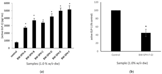 Following a 4 h incubation period, all BWSPHs tested increased the secretion of active GLP-1 in STC-1 cells compared to the basal control (Krebs–Ringer buffer) (p < 0.05) (Figure 5a). The concentration of active GLP-1 secreted from STC-1 cells exposed to BWSPHs ranged from 2727.6 ± 160.5 pg/mL (BW-SPH-A) to 5163.8 ± 495.6 pg/mL (BW-SPH-F), with Krebs–Ringer buffer only stimulating the secretion of 769.7 ± 63.5 pg/mL active GLP-1 from STC-1 cells (Figure 5a). As active GLP-1 concentrations were highest in cells treated with undigested hydrolysate BW-SPH-F, SGID hydrolysate BW-SPH-F-GI was chosen to assess if in vitro digestion influenced BWSPH’s active GLP-1 stimulating ability. The GLP-1 stimulating ability of BW-SPH-F was lost following SGID as active GLP-1 concentrations in STC-1 cells exposed to BW-SPH-F-GI were significantly lower than the Krebs–Ringer buffer control (p < 0.05) (Figure 5b).
