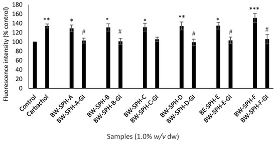 STC-1 cells were seeded in 96 well plates at a density of 0.25 × 106 cells/mL and final volume of 200 μL per well, for 24 h. After 4 h exposure to 100 μL of BWSPHs (1.0% w/v dw), SGID BWSPHs (1.0% w/v dw), carbachol (1mM) (positive control) or Krebs–Ringer buffer (negative control) took place, Fluo-4 AM intracellular calcium probe prepared in Krebs–Ringer buffer (5 μM) was added and cells were further incubated for 1 h at 37 °C. Cell monolayers were then washed 2 times with Krebs–Ringer buffer, which was supplemented with sulfinpyrazone (0.1 mM) to inhibit changes in cytosolic calcium levels. Fluorescence (excitation 488 nm and emission 520 nm) was measured using a microplate reader (Varioskan TM Flash Multimode Reader, Thermoscientific, Waltham, MA, USA).