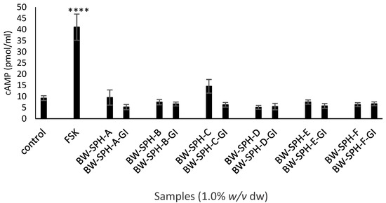 Intracellular cyclic adenosine monophosphate (cAMP) levels in STC-1 cells after 4 h exposure to blue whiting soluble protein hydrolysates (BWSPHs, BW-SPH-A to BW-SPH-F) (1.0% w/v dw) and simulated gastrointestinal digested (SGID) BWSPHs (BW-SPH-A-GI to BW-SPH-F-GI) (1.0% w/v dw), and controls (positive control was forskolin (FSK) (10 µM) and negative control was Krebs–Ringer buffer). Test samples and controls were supplemented with 1 mM 3-isobutyl-1-methylxanthine (IBMX). Data are expressed as mean ± SEM of three independent experiments. Significance was measured using ANOVA followed by Dunnett’s test. **** denotes statistical significance between samples and the negative control (p < 0.0001).