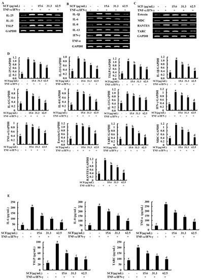Inhibitory effect of SCF on mRNA expression of inflammatory cytokines and chemokines. Effect of SCF against the mRNA expression of (A) epithelial and epidermal innate cytokines, (B) inflammatory cytokines, (C) chemokines, (D) densitometry analysis, and (E) ELISA analysis of cytokines and chemokines production in TNF-α/IFN-γ-stimulated HaCaT keratinocytes. The reproducibility of the results was confirmed by three independent determinant determinations (n = 3, mean ± SE). Error bars with different letters show a significant difference (p ˂ 0.05).