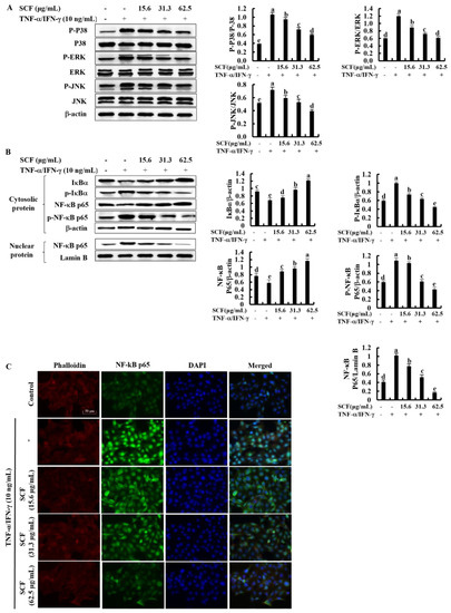 A total of 1 × 106 cells/dish were seeded in 6 cm culture dishes for 24 h and treated with 15.6, 31.3, and 62.5 μg/mL of SCF treatment before TNF-α/IFN-γ stimulation. After that, cells were harvested and lysed using the NE-PER® nuclear and cytoplasmic extraction kit. Totals of 30 µg of protein of each lysate were electrophoresed on 10% polyacrylamide gels after protein concentrations in cell lysate were estimated using a BCA protein assay kit. Resolved protein bands were transferred onto nitrocellulose membranes (Merck Millipore, Ireland), and blocked for 2 h with 5% skim milk in TBST. Then, sequentially incubated with monoclonal primary antibodies (1:1000) and HRP-conjugated secondary antibodies (1:3000). Identified protein bands were visualized by adding enhanced chemiluminescence (ECL) reagent on a Core Bio Davinch-ChemiTM imaging system (Seoul, Korea).