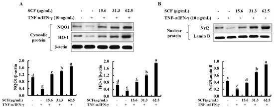 The Nrf2/HO-1 signaling pathway is a key mediator in protecting cells from oxidative damage [28]. To assess whether SCF affects the Nrf2/HO-1 signaling pathway, levels of cytosolic HO-1, NQO1, and nuclear-translocated Nrf2 were investigated using Western blot analysis. As shown in Figure 4A, cytosolic HO-1 and NQO1 were down-regulated following cellular stimulation with TNF-α/IFN-γ, while significantly increased by the SCF treatment dose-dependently. Moreover, TNF-α/IFN-γ stimulation decreased nuclear translocation of Nrf2, while SCF treatment dose-dependently increased nuclear Nrf2 expression compared to TNF-α/IFN-γ-stimulated HaCaT keratinocytes, revealing its cytoprotective effect (Figure 4B).