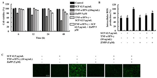 The cytoprotective effect of SCF on TNF-α/IFN-γ-stimulated HaCaT keratinocytes was investigated concerning variations in time-dependent cell viability and ROS production in the presence of ZnPP by inhibiting HO-1 activity. As shown in Figure 5A,B, TNF-α/IFN-γ stimulation significantly decreased cell viability and increased intracellular ROS production, while SCF treatment effectively increased cell viability by reducing the production of ROS dose-dependent manner. Nevertheless, the HO-1 inhibitor ZnPP significantly abolished the increment of cell viability and caused a reduction of intracellular ROS production. Similarly, the effect of the ZnPP on intracellular ROS production in SCF treated TNF-α/IFN-γ-stimulated HaCaT keratinocytes was investigated by fluorescence microscopy DCF-DA assay (Figure 5C). Besides, the effect of SCF on cell viability in TNF-α/IFN-γ-stimulated HaCaT keratinocytes gradually decreased with time. As expected, ZnPP reduced the cell viability which had been increased by SCF over time.