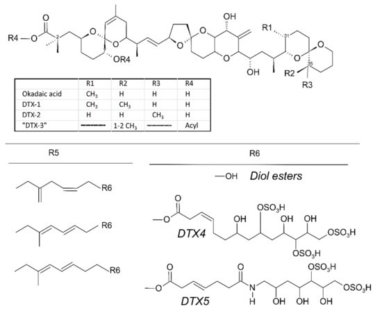 Structure of okadaic acid (OA), dinophysistoxins (DTXs) and their derivatives. DTX3 is produced by metabolic acylation of the main toxins in bivalves. Diol esters, DTX4 and DTX5 are produced in phytoplankton by esterification of different chains with the carboxylic function of the main toxins.