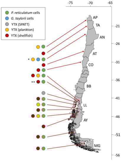 Latitudinal distribution of historic yessotoxins (YTX) events associated with Protoceratium reticulatum and Gonyaulax taylorii. Asterisks indicate sites where cell maxima occurred during the two most severe events of P. reticulatum in Antofagasta (* max. 383,520 cells L−1) and Los Lagos (** max. 12,000 cells L−1) regions in summers 2007 and 2015, respectively.