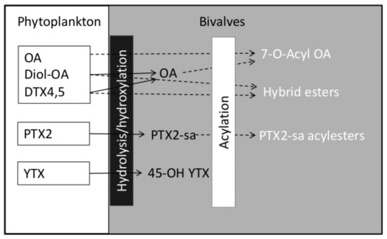 - Rossignoli, A.; Fernández, D.; Regueiro, J.; Mariño, C.; Blanco, J. Esterification of okadaic acid in the mussel Mytilus galloprovincialis. Toxicon 2011, 57, 712–720. [Google Scholar] [CrossRef]