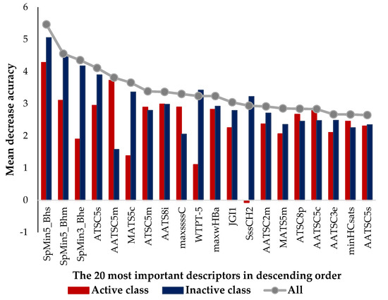 The selected 200 descriptors included 164 1D&2D (115 topological descriptors, 48 count type descriptors and one constitutional descriptor (Mannhold LogP, logarithm of the octanol–water partition coefficient)) and 36 RDF 3D descriptors (12 of type a (a positive and a negative charge), 12 of type b (two positive charges) and 12 of type c (two negative charges)). The 1D&2D descriptors comprised 72 autocorrelation topological descriptors, which were 50 Broto–Moreau, 12 Moran and 10 Geary autocorrelation descriptors, weighted by mass, charges, van der Waals volumes, Sanderson electronegativities, polarizabilities, first ionization potential or I-state. Other topological descriptors, such as 6 Barysz matrices, 24 Burden-modified eigenvalues, 1 Detour matrix, 2 MDEs, 2 path counts, 3 topological charges, 3 distance matrices, 1 walk count descriptor and 1 weighted path descriptor, were also presented. The count type descriptors included 28 electrotopological state atom types, 10 extended topochemical atoms and 10 information content descriptors. A comparison of the best twenty 1D&2D + RDF molecular descriptors selected by descriptor importance of RF was used to build the QSAR classification models, which are presented in Table 3 and Table 4, and these were analyzed and are presented in Figure 1.