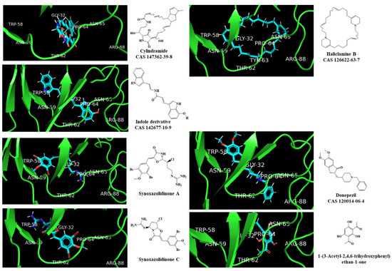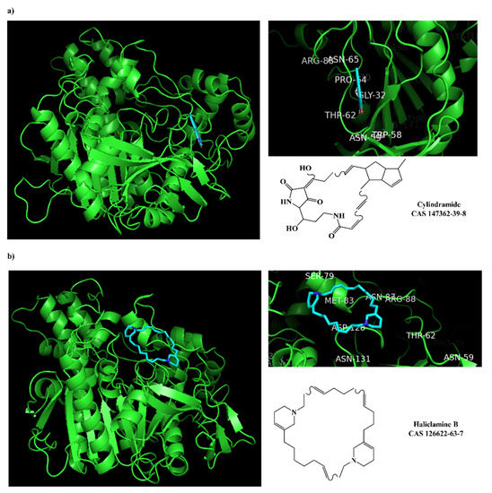 The 125 MNPs from Encinar’s database selected by the QSAR classification approach were screened by molecular docking against AChE enzyme (PDB ID: 6TT0) [54]. The antifouling agents, synoxazolidinone A, synoxazolidinone C and donepezil, known as AChE inhibitors [28], were used as positive controls and the phenolic derivative that was predicted to not have antifouling activity in virtual screening was used as a negative control in the molecular docking experiments. A list of virtual screening hits comprising 19 MNPs was approved based on molecular docking experiments, in which a threshold of ΔGB ≤ −7 kcal/mol was established for predicting the affinity between AChE and selected MNPs. To prioritize the best marine drug-like leads as antifouling AChE inhibitors from the list of 19 selected MNPs by the antifouling QSAR model and molecular docking of AChE enzyme, the absorption, distribution, metabolism, excretion and toxicity (ADMET) properties were predicted via in silico methods using the pKCSM software (http://biosig.unimelb.edu.au/pkcsm/, accessed on 25 October 2021) [55]. Sixteen MNPs, a macrocyclic lactam (CAS 156310-18-8), seven macrocyclic alkaloids (CAS 126622-63-7, 126622-64-8, 156310-18-8, 155944-26-6, 157536-35-1, 105305-54-2 and 105418-77-7), seven indole derivatives (CAS 142677-10-9, 134029-43-9, 134029-44-0, 134029-45-1, 142677-09-6, 223596-72-3, 134779-34-3) and a pyridine derivative (CAS 59697-14-2) were proposed as marine drug-like leads as antifouling AChE inhibitors. Three MNPs were excluded due to their predicted toxicity to fish, namely against flathead minnows. The Autodock Vina software (http://vina.scripps.edu/, accessed on 25 October 2021) [56] was used to perform the flexible virtual screening of the 125 MNPs to find the most favorable binding interactions, and the calculated free binding energies by the set of search space coordinates are reported in Table 6 for the 16 MNPs selected, and the positive (synoxazolidinone A and C; donepezil, an AChE inhibitor used for Alzheimer disease therapy) and the negative (phenolic derivative derivative) controls.