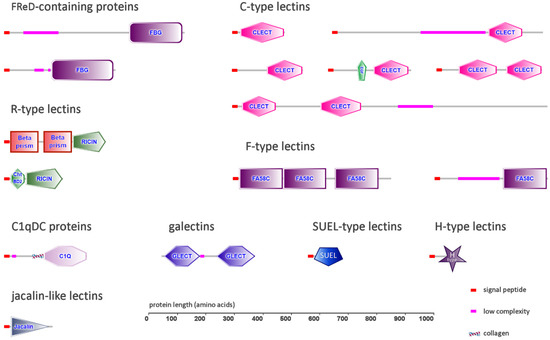 C-type lectins (CTLs) are one of the largest and most studied families of lectins in lophotrochozoans, with several dozen proteins having been functionally characterized in mollusks and segmented worms [51,52,53]. Their characterizing CRD, which displays a broad calcium-dependent binding specificity, is often found in large multidomain membrane-bound proteins which may or may not have a lectin function [54,55]. Their remarkable structural diversity has led to the development of a complex classification system, which has been subjected to multiple updates over the years [54,56,57]. Since such a classification still appears to be strongly biased towards vertebrates, it is not fully adequate to describe the variegate domain combinations found in animal CTLs.