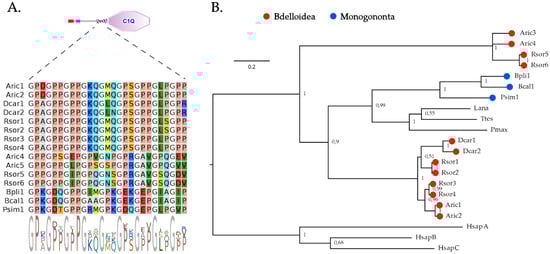 (A) Schematic structure of the C1qDC proteins identified in rotifers, with a zoom on the collagen region. (B) Bayesian phylogeny of C1qDC proteins from rotifers, obtained with 500,000 generations of an MCMC analysis, run under an LG+I+G model of molecular evolution. The numbers shown close to each node represent posterior probability support values. Aric: A. ricciae; Rsor: R. sordida; Psim: P. similis; Dcar: D. carnosus; Bcal: B. calyciflorus; Bpli: B. plicatilis; Lana: Lingula anatina; Pmax: Pecten maxiumus; Ttes: Testudinalia testudinalis; Hsap: Homo sapiens. Human sequences were used as an outgroup for tree-rooting purposes; A, B and C indicate the human C1qA, C1qB and C1qC chains.