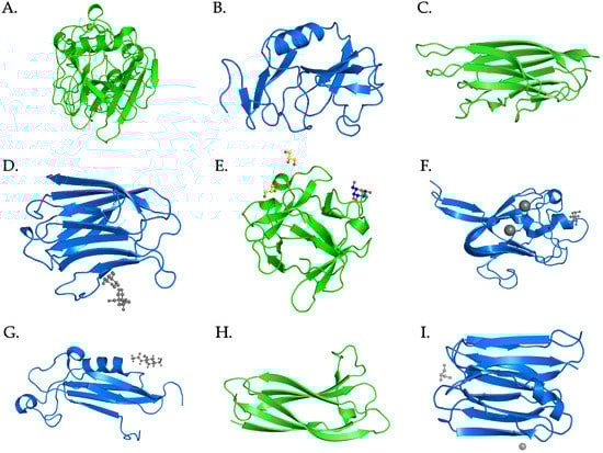 Three-dimensional folding of the carbohydrate-recognition domains of representative members of the nine lectin families identified in Rotifera. (A) C-type lectin domain, pdb entry: 1b6e; (B) fibrinogen C-terminal domain, pdb entry: 1fib; (C) C1q domain, pdb entry: 4ous; (D) galectin domain, pdb entry: 1a3k; (E) R-type lectin β-trefoil domain, pdb entry: 4iyb; (F) F-type lectin domain, pdb entry: 1k12; (G) SUEL-type lectin domain, pdb entry: 2jx9; (H) H-type lectin domain, pdb entry: 2ces; (I) jacalin β-prism domain, pdb entry: 3apa. The figures are reproduced courtesy of PDBe (https://www.ebi.ac.uk/pdbe/, accessed on 20 January 2022).
