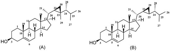 Gorgosterol (A) and 23-demethylgorgosterol (B).