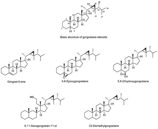 Gorgostane is a steroid with a basic molecular formula of C30 H52 (Figure 2). Most are pentacyclic, with the exception of secogorgosterols, which are tetracyclic steroids. Both gorgosterol and secogorgosterol have a side chain containing a characteristic cyclopropane moiety. The cyclopropane moiety of the gorgostane steroid (C-22, C-23, and C-30) showed characteristic signals in 13C NMR at 32.1, 25.8, and 21.3 ppm, respectively. According to the number of rings, the presence and position of unsaturation, and the number of substituents, gorgostane can be classified into different groups.