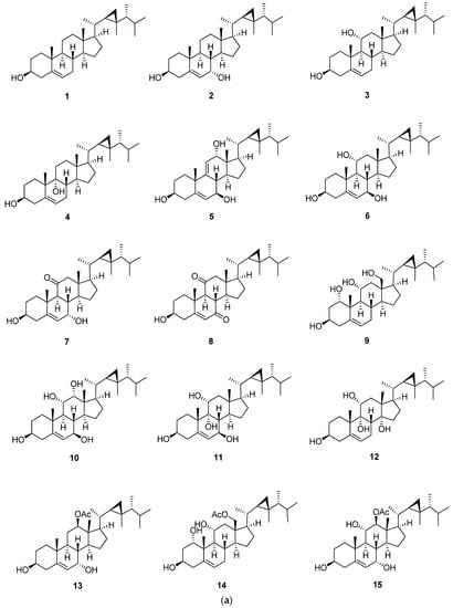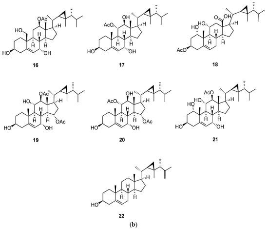 (a) Structures of isolated gorgost-5-ene steroids (1–15); (b) Structures of isolated gorgost-5-ene steroids (16–22).