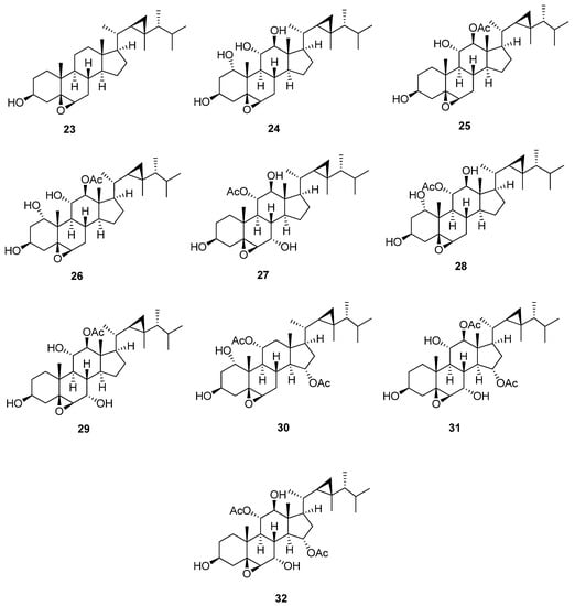 Structures of isolated 5,6-epoxygorgostane steroids (23–32).
