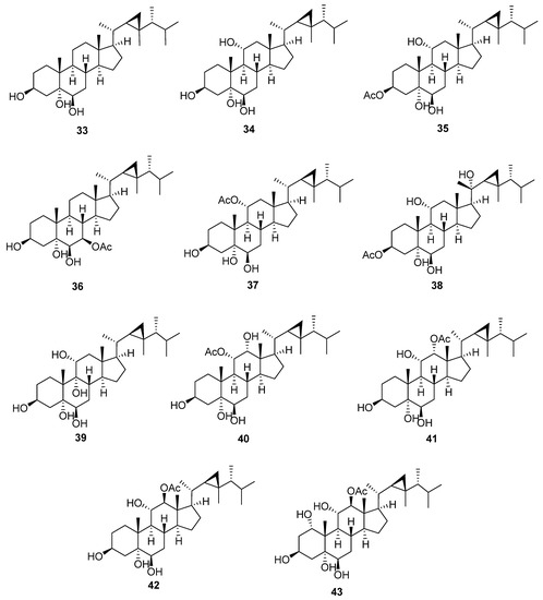 Structures of isolated 5,6-dihydroxygorgostane steroids (33–43).