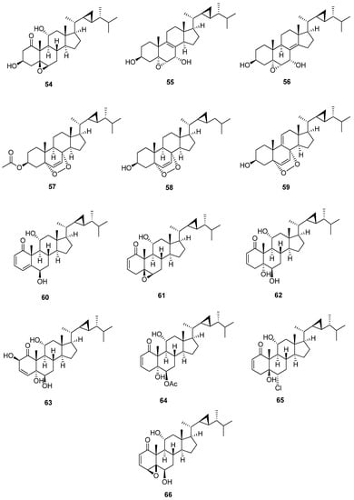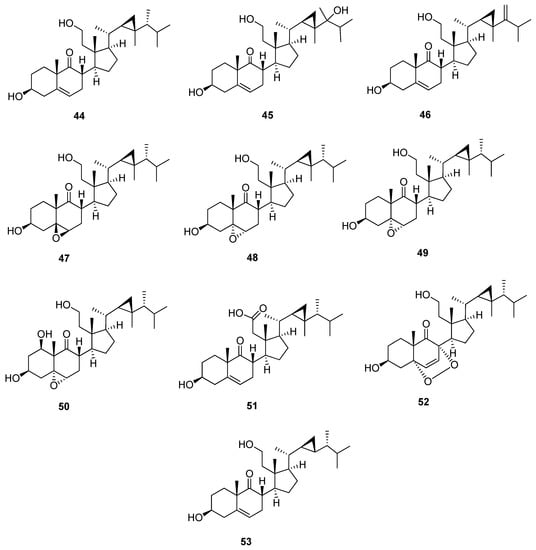 9,11-Secogorgostane is characterized by the opening of ring C at C-9 and C-11. It is characterized by the presence of a ketone carbonyl carbon at C-9 and a primary alcohol group at C-11 (Figure 6 and Table 7). In 13C-NMR, C-9 and C-11 of 3β,11-dihydroxy-9,11-secogorgost-5-en-9-one (44) showed characteristic signals at 217.4 and 60.0 ppm, respectively. The chemical shifts of C-9 and C-11 of 9,11-secogorgostane consequently changed according to substitutions. Compounds 3β,11-dihydroxy-9,11-secogorgost-5-en-9-one (44), 3β,11,24-trihydroxy-9,11-secogorgost-5-en-9-one (45), and ameristerol A (46) [33,34,35] have the same structure and substitutions with a double bond between C-5 and C-6 except for the second compound containing a hydroxyl group at C-24 with a chemical shift of 74.5 ppm and the latter compound containing an additional double bond between C-24 and C-28 with a characteristic chemical shift of 161.4 and 105.3 ppm, respectively. Compounds 3β, 11-dihydroxy-5β, 6β-epoxy-9,11-secogorgostan-9-one (47), and 5α,6α-epoxy-3β,11-dihydroxy-9,11-secogorgostan-9-one (48) [36,37] are similar, except the first compound has a 5β, 6β-epoxy group at C-5 and C-6, and the others a 5α, 6α-epoxy group with a chemical shift of 65.4, 58.2 ppm and 60.9, 60.0 ppm, respectively. 3β,7β,11-trihydroxy-5α,6α -epoxy-9,11-secogorgostan-9-one (49) and 5α,6α-epoxy-1β,3β,11-trihydroxy-9,11-secogorgostan-9-one (50) [9,37] have the 5β, 6β-epoxy groups but with different substitutions in C-7 and C-1 with chemical shifts of 67.0 and 69.9 ppm, respectively, which affect the chemical shift of the neighboring carbons. Klyflaccisteroid F (51) [13] is a 9,11-secogorgost-5-ene skeleton containing a carboxyl group at C-11 with a chemical shift of 174.4 ppm. On the other hand, klyflaccisteroid K (52) [38] is a 5α,8α-epidioxy-9, 11-secogorgostane containing a double bond between C-6 and C-7 with a chemical shift of 141.2 and 130.2 ppm, respectively. Moreover, the chemical shift of C-3 is more upfield (65.9 ppm) than other 9, 11-secogorgostanes due to the presence of a 5α,8α-epidioxy group in this compound. Leptosterol C (53) [39] is a 9, 11-secogorgost-5-ene structure with a 23-demethyl side chain containing 29 carbons. Moreover, the chemical shift of C-24 is more upfield (44.8 ppm) than other 9, 11-secogorgostanes due to the absence of C-23 on the side chain cyclopropane moiety.
