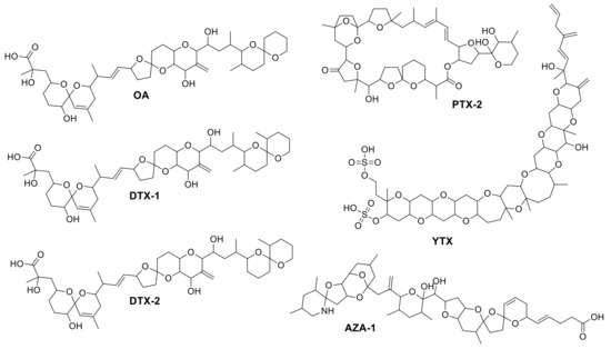 Structures of OA, DTX-1, DTX-2, PTX-2, YTX and AZA-1.