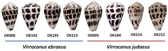 The closely related cone snails Virroconus ebraeus and Virroconus judaeus are considered cryptic species showing shells very similar in color and patterns, which are very difficult to tell apart (Figure 1). Both species can be found commonly living in sympatry in intertidal rocky habitats of the Indo-Pacific region. The species V. ebraeus is widely distributed in tropical waters from the east coast of Africa to the west coast of Central America, except the Red Sea []. Little is known about the range of distribution of V. judaeus, although it is considered to have a narrower distribution, comprising the Indian Ocean and the western Pacific Ocean. Although V. judaeus was originally described based on radular differences [], it was not until few years ago that this species could be unequivocally differentiated from V. ebraeus using mitochondrial gene sequences []. More recently, phylogenetic relationships within Virroconus were analyzed based on mitochondrial and nuclear loci []. The mitochondrial phylogeny recovered V. judaeus as sister to Virroconus coronatus (which has very distinct shell color and pattern), whereas V. ebraeus was sister to Virroconus chaldeus []. Instead, the nuclear markers recovered V. ebraeus and V. judaeus as sister species and thus supported their similarities in shell morphology. The tree discordances and further statistical tests supported a past event of mitochondrial genome introgression caused by hybridization between the ancestors of V. judaeus and V. coronatus [].