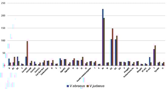 The expression of the different conotoxin precursor superfamilies and hormones was compared between V. ebraeus and V. judaeus to find significant differences between these cryptic species and associate them to potential diet differences. First, relative expression was analyzed by normalizing the count for each of the transcripts as TPMs, and by aggregating the values of all sequences belonging to the same superfamily. The most expressed conotoxin precursor superfamilies in V. ebraeus were SF-mi2, M, O1, B2, and F, with the SF-mi2 and M superfamilies accounting for up to 49.4% of all expression. This pattern is in agreement with most expressed superfamilies previously reported for V. ebraeus []. The most expressed superfamilies in V. judaeus were Cerm03, M, O2, I2, and O1, with the Cerm03 and M superfamilies accounting for up to 49% of the expression.