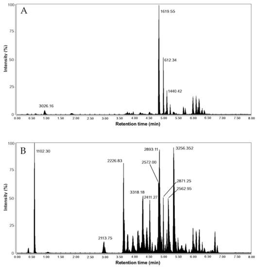 Reverse phase ultra-high-performance liquid chromatography (RP-UHPLC) was carried out at the Servicio Central de Ciencia y Tecnologia (SCCyT) of the University of Cadiz on an ACQUITY H-Class UHPLC system (Waters, Milford, MA, USA), with a binary solvent system and an automatic sample manager equipped with an ACQUITY UPLCr BEH C18 (2.1 × 50 mm, 1.7 µm) column, running at 50 °C. The mobile phases consisted of eluent A (0.1% formic acid in water, v/v) and eluent B (0.1% formic acid in acetonitrile, v/v). These phases were delivered at a flow rate of 0.6 mL/min by using a linear gradient program as follows: 0–14 min, 95–5%A; 14–16 min, 5–95% A; and 16–18 min, 95–5% A. The injection volume was 2 μL. The UHPLC was coupled to a XEVO-G2-S QTOF quadrupole time-of-flight tandem mass spectrometer equipped with an electrospray (ESI) source. The operating parameters in ESI were set as follows in positive mode: sample cone voltage of 20 V, source temperature of 120 °C, cone gas flow of 10 L/h, and desolvation gas flow of 850 L/h. Acquisitions were carried out over the range of 100 to 3000 Da. The m/z Leucine-enkephalin (m/z 556.2771 in positive ion mode) was used as the external reference of LockSpray infused at a constant flow of 5 μL/min. Data acquisition and visualization was performed using MassLynx 4.1 software (Waters, Manchester, UK) in positive-ion mode.