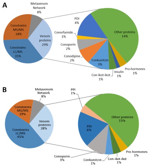 The majority of the identified proteins (63–64%) corresponded to conotoxins (Figure 5). Most matched sequences obtained from the venom duct transcriptomes of V. ebraeus and V. judaeus, but a database search also yielded several records corresponding to sequences from the corresponding transcriptomes of cone snail species closely related in the phylogeny [], such as West African species of the genera Varioconus, Kalloconus, and Africonus, and the Mediterranean species Lautoconus ventricosus [], or to the more distantly related Indo-Pacific species of the genus Profundiconus []. In addition to conotoxins, numerous other venom proteins were identified in the proteome, including conoporins, conodipines, conkunitzins, con-ikot-ikots, protein disulfide isomerases (PDIs), peptidyl prolyl cis-trans isomerases (PPIs), ferritins, and thioredoxins, among others (Figure 5). Several prohormones and one type-3 insulin were also detected (Figure 5). Along with these proteins, a number of sequences from the so-called Metavenom Network (MVN), a cluster of housekeeping genes that co-express with venom genes in venomous amniotes, were also detected [] (Figure 5).